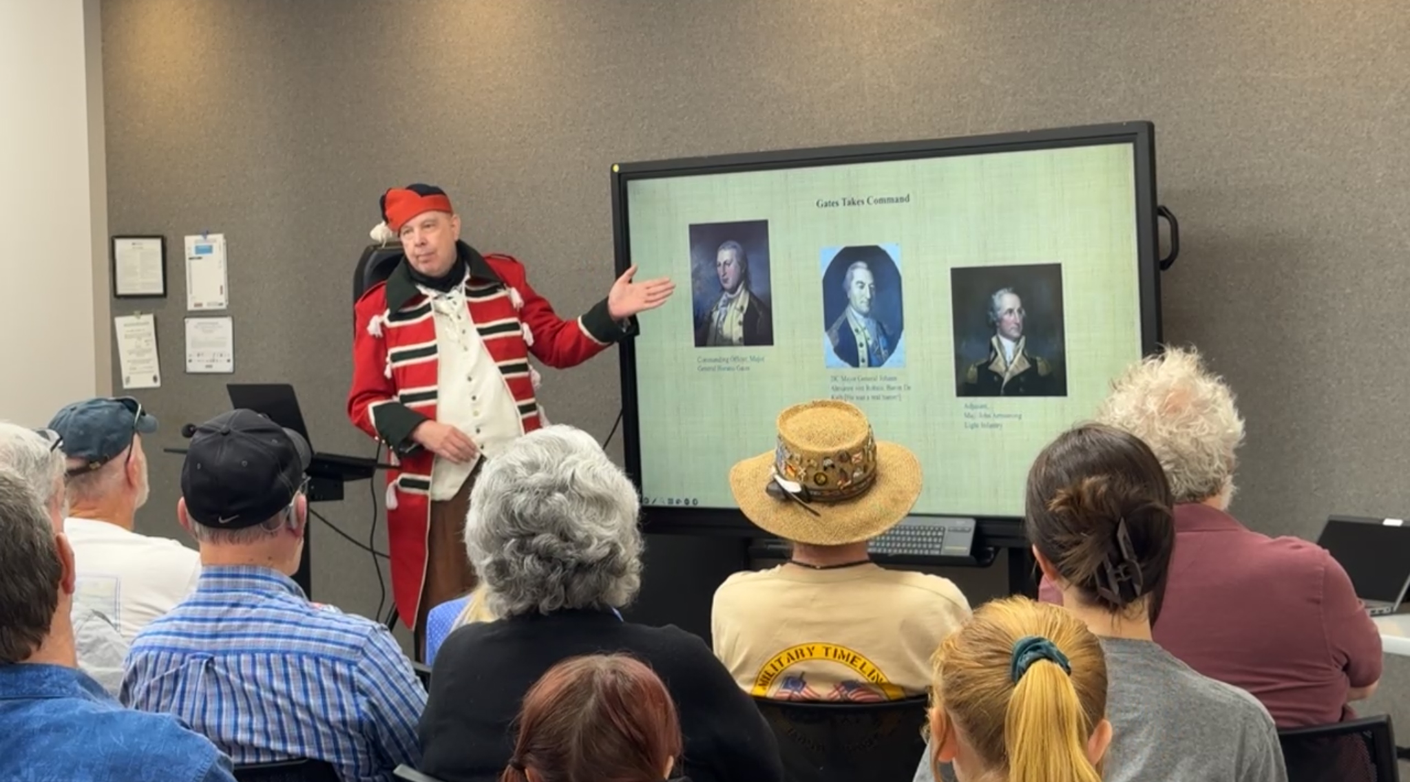 Stacy spoke at another Noon Debrief on May 30 about another famous engagement of that war, the Battle of Camden. Don’t be surprised if he shows up, as he did on that occasion, wearing a British redcoat uniform. He is very dedicated to telling that side of the war, as well as the one most Americans are used to hearing.